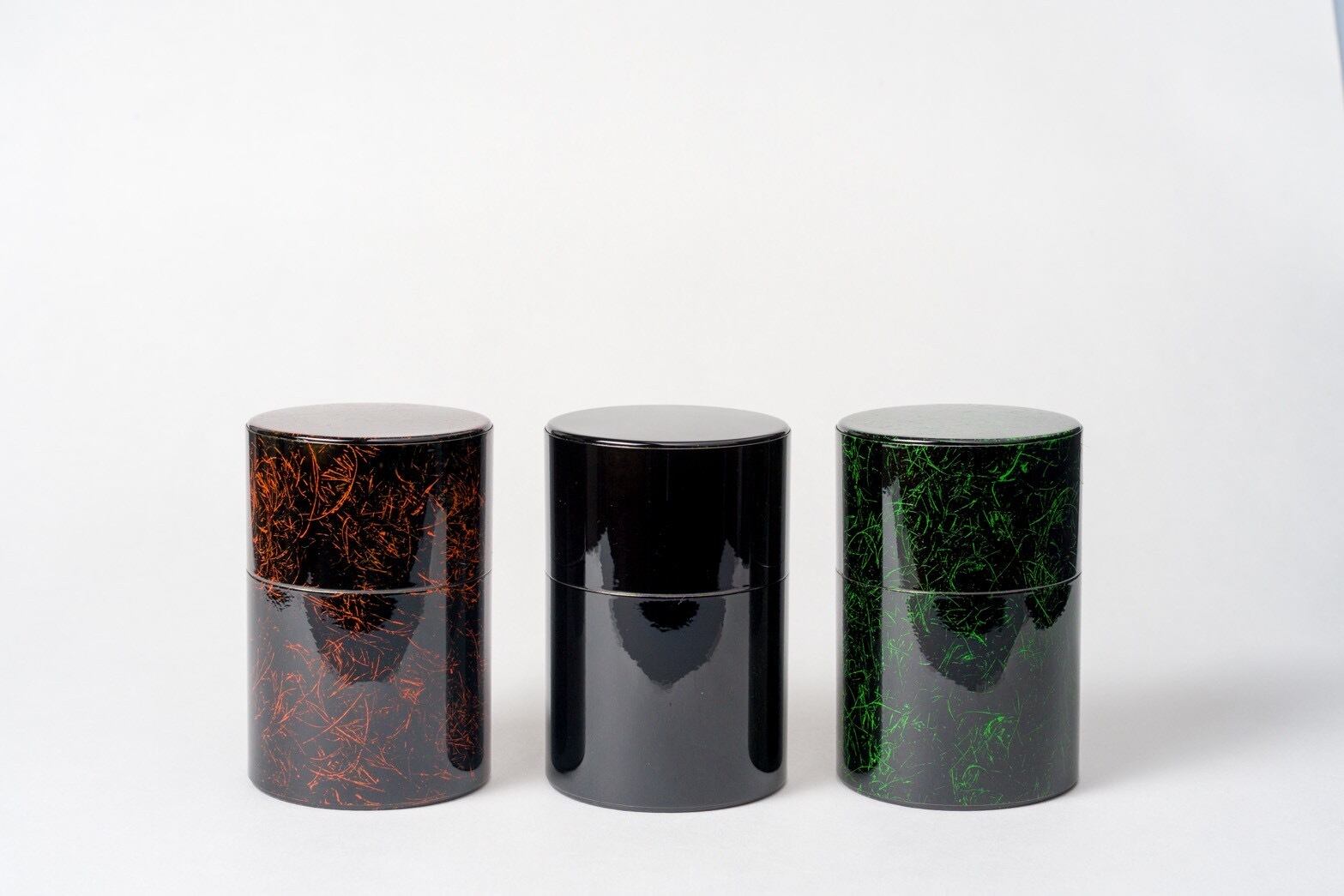 そこに黒の「カシュー漆」という塗料に緑や朱のカシュー漆を毛叩きという技法で加飾した